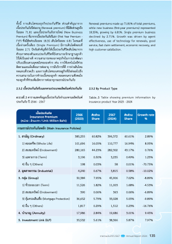 ทั�งนี� การเติบัโตขอุงธุุรกิจปัระกันชีีวิิต ส่วินสำาคัญมาจาก Renewal premiums made up 71.81% of total premiums,