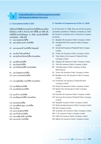 3.1 จำานวนบริษ์ัทประกันชีวิต ปี 2567 3.1 Number of Companies (as of Dec 31, 2024)