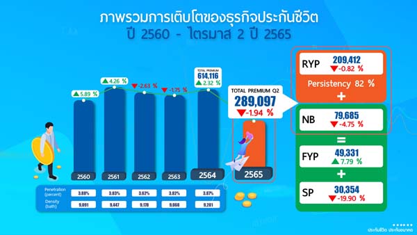 2565 ระหว่าง มกราคม – มิถุนายน มีเบี้ยประกันภัยรับรวมอยู่ที่ 289,097 ล้านบาท เติบโตลดลงร้อยละ 1.94 เมื่อเทียบกับช่วงเดียวกันปี